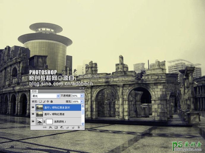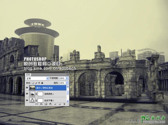 今天我们来学习一篇PS照片后期调色教程实例,photoshop调出古典怀旧色彩建筑风景图片,本教程的调色过程有点独特,作者先用调色工具把图片调成个性的偏色图片,然后再用通道叠加等消除杂色,做成较为中性的古典效果。 最终效果 原图 1、调节