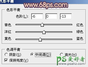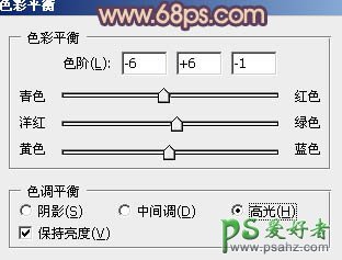 5、创建色彩平衡调整图层,对中间调及高光进行调整,参数设置如图12,13,效果如图14。