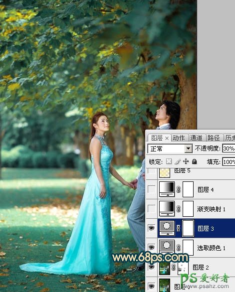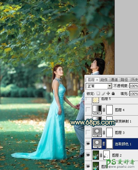 今天我们来学习一篇PS婚片后期调色实例教程,photoshop调出柔美的暖色效果婚片男女艺术照,本教程介绍暖色图片调色方法。原图素材图片基本都是绿色,处理的时候需要逐步把绿色都转为中性或暖色。然后再把人物部分调成相应的暖色即可。 最终效果