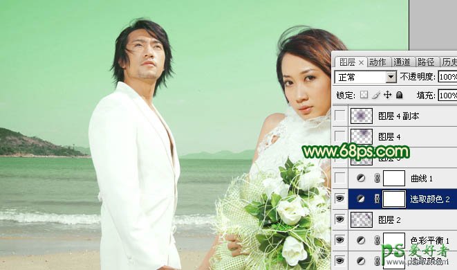 今天我们来学习一篇PS婚片后期调色教程实例,photoshop调出嫩绿色海景情侣婚纱照,本教程介绍青绿色图片调色方法。调色的时候重点把背景部分调成青色,可以根据实际图片的颜色构成选择不同的方法调整。人物部分可以根据背景颜色调成粉色后会更加甜