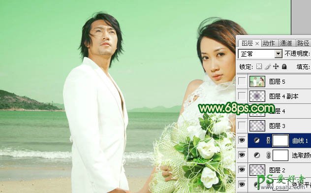 photoshop调出嫩绿色海景情侣婚纱照