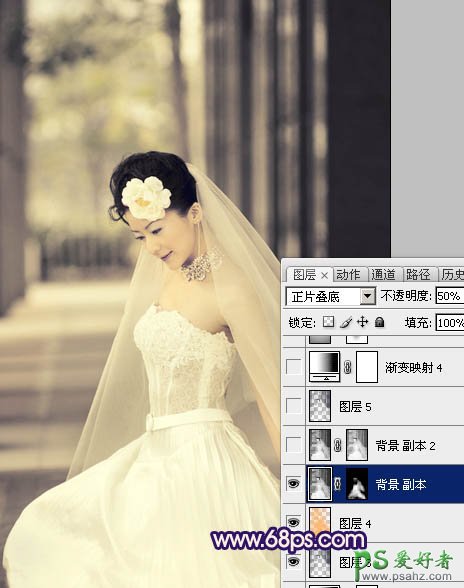 8、新建一个图层,按Ctrl + Alt + Shift + E 盖印图层。按Ctrl + Shift + U 去色。图层混合模式改为“正片叠底”,不透明度改为:50%,按住Alt 键添加图层蒙版,用白色画笔把人物衣服部分擦出来。