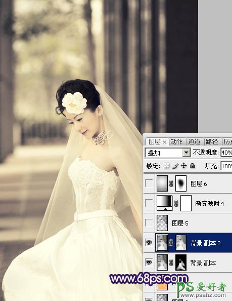 9、新建一个图层,盖印图层。按Ctrl + Shift + U 去色,按Ctrl + Alt + ~ 调出高光选区,添加图层蒙版,图层混合模式改为“叠加”,不透明度改为:40%。