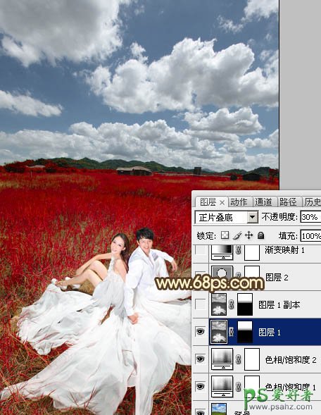 2、新建一个图层,按Ctrl + Alt + Shift + E 盖印图层。按Ctrl + Shift + U 去色,图层混合模式改为“正片叠底”,不透明度改为:30%,加上图层蒙版只保留天空部分,其它部分用黑色画笔擦掉。