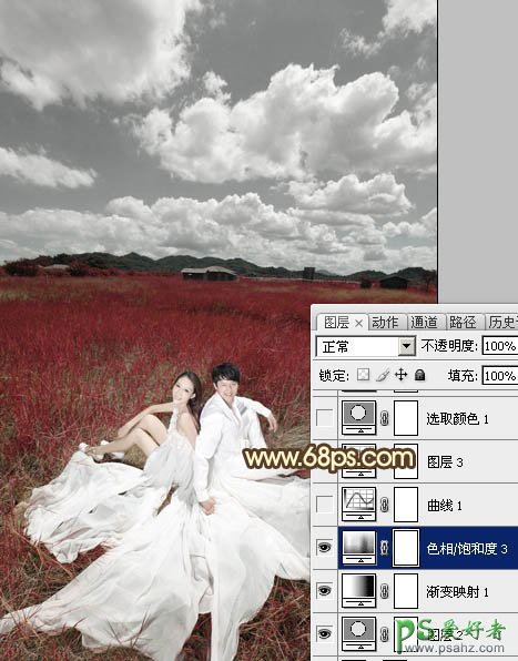 PS调色教程:给情侣婚纱照调出暗红色草原婚片