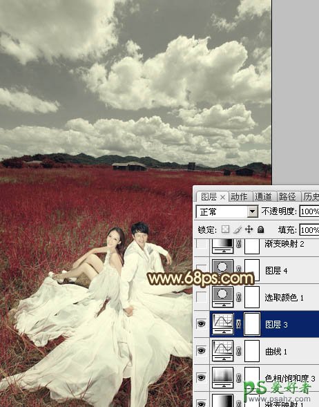 PS调色教程:给情侣婚纱照调出暗红色草原婚片
