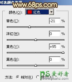 9、创建可选颜色调整图层,对红,黄进行调整,参数设置如图17,18,效果如图19。