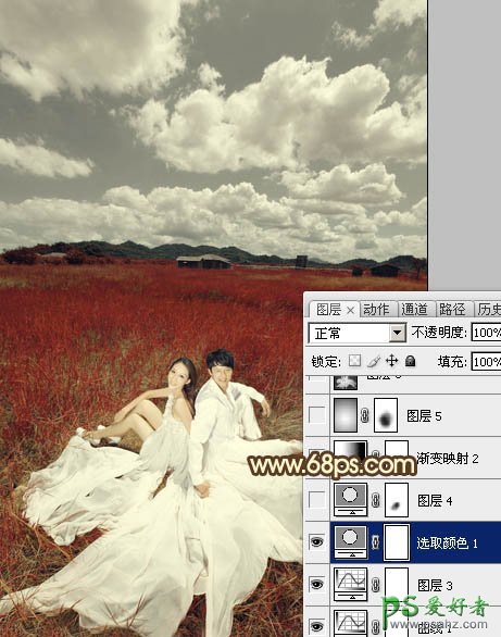 PS调色教程:给情侣婚纱照调出暗红色草原婚片