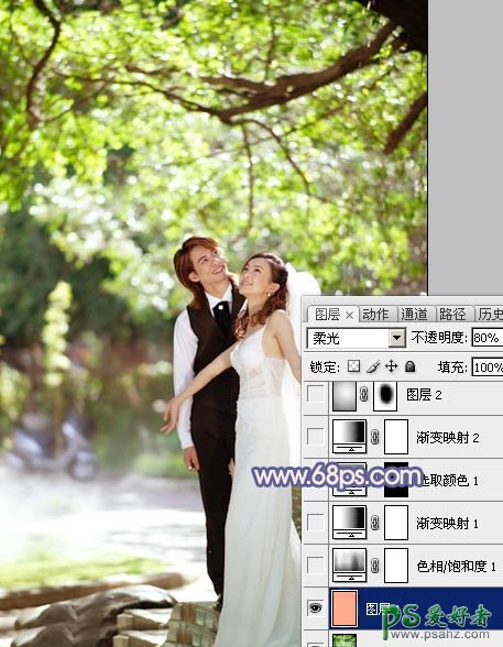 1、打开原图素材,新建一个图层填充颜色:#FFAB8C,图层混合模式改为“柔光”,不透明度改为:80%,效果如下图。
