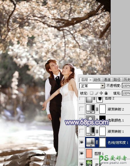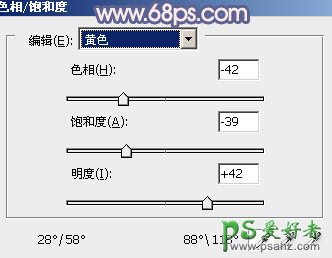 2、创建色相/饱和度调整图层,选择黄色,用吸管吸取树叶颜色再调整,参数设置如图2,效果如图3。