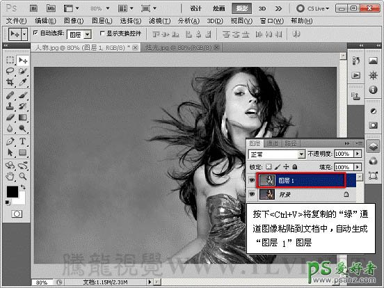3、切换到“图层”调板,将绿通道图像粘贴到文档中。