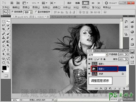 4、使用同样的方法,复制炫光图像绿通道中的图像到“人物”文档中,并调整图层顺序。