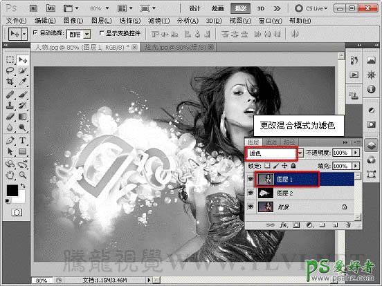 5、选择“图层 1”,设置图层混合模式为“滤色”。
