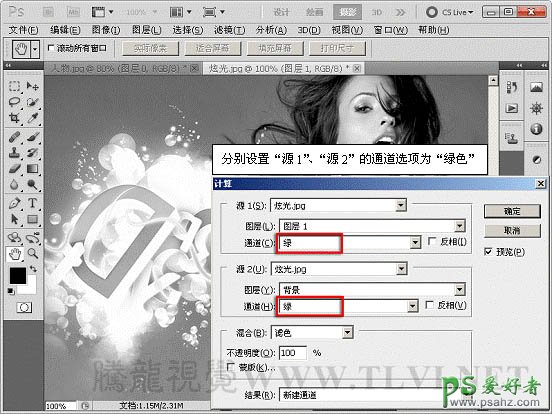 12、分别设置“源1”、“源2”的通道选项为“绿色”,得到更加清晰的混合效果。