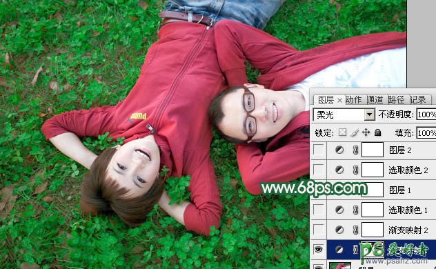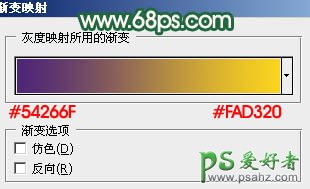 1、打开原图素材,创建渐变映射调整图层,颜色设置如图1,确定后把图层混合模式改为“柔光”,用黑色画笔把人物部分擦出来,如图2。