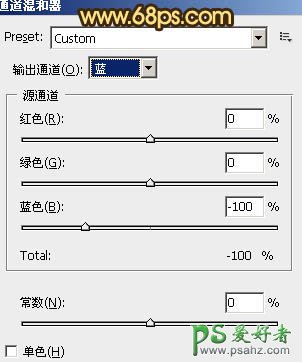 混合器调整图层,对蓝色进行调整,参数设置如图1,效果如图2。