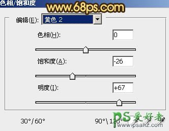 6、创建色相/饱和度调整图层,选择黄色,用吸管吸取背景颜色再调整,参数设置如图13,效果如图14。