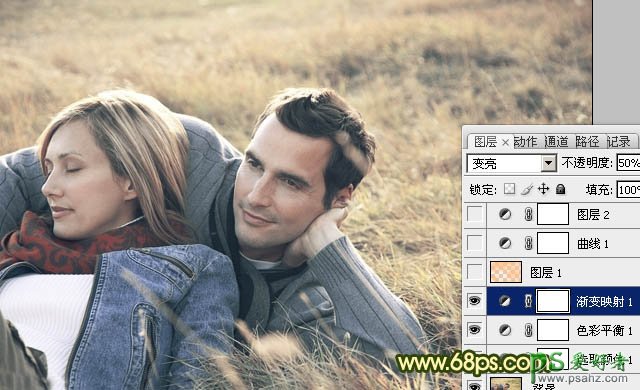 3、创建渐变映射调整图层,颜色设置如图7,确定后把图层混合模式改为“变亮”,不透明度改为:50%,效果如图8。