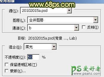 7、新建一个图层,按Ctrl + Alt + Shift + E 盖印图层。选择菜单:图像 > 模式 > Lab颜色。选择不合拼。然后执行:图像 > 应用图像,参数设置如图14,效果如图15。
