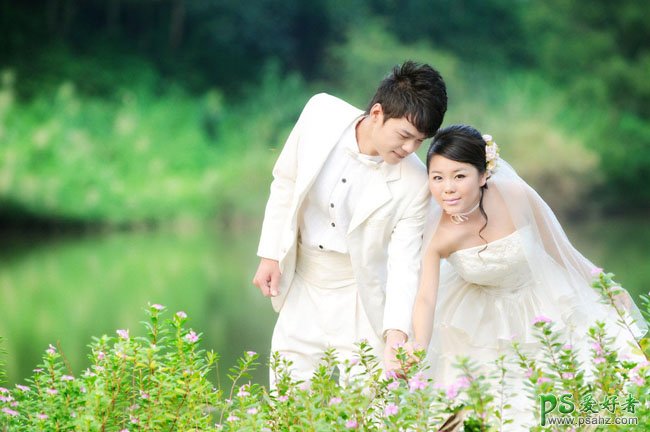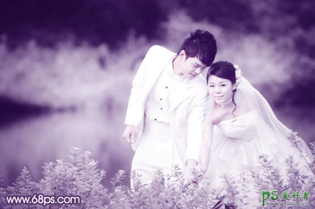 PS婚片后期调色实例教程,photoshop给情侣婚片快速调出梦幻的淡紫色效果,本教程介绍淡紫色外景图片调色方法。过程也比较简单,先对素材进行一些简单的美化,然后用渐变映射等快速转为紫色调,再修饰一下细节并柔化处理即可。