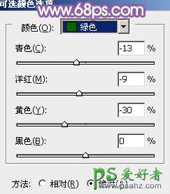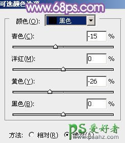 1、打开素材图片,创建可选颜色调整图层,对黄、绿、黑进行调整,参数设置如图1 - 3,效果如图4。这一步把背景部分的黄绿色转为鲜绿色。