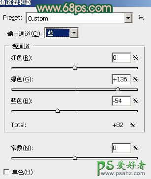3、创建通道混合器调整图层,对蓝色进行调整,参数设置如图5,效果如图6。
