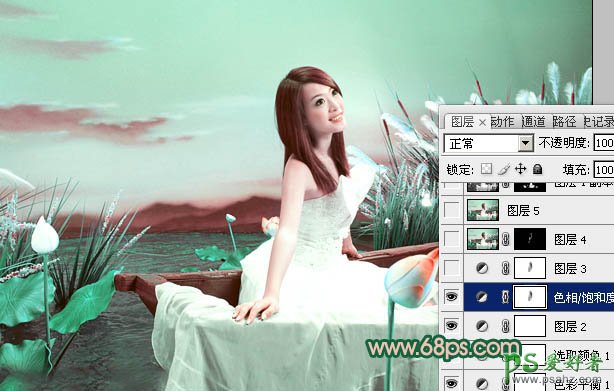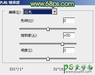 7、创建色相/饱和度调整图层,对红色进行调整,参数设置如图13,确定后用黑色画笔把人物脸部擦出来,效果如图14。
