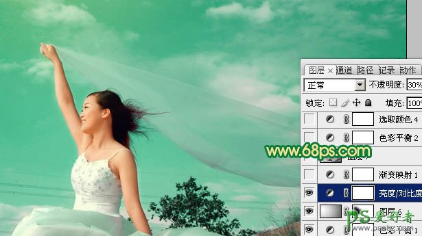 12、创建亮度/对比度调整图层,参数设置如图23,确定后把图层不透明度改为:30%,效果如图24。