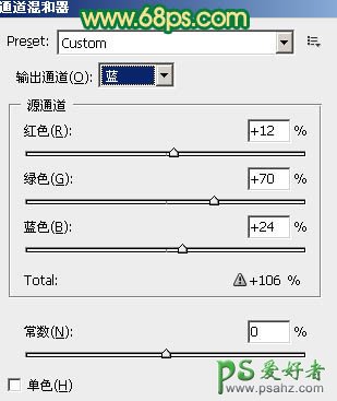 混合器调整图层,对蓝色进行调整,参数设置如图1,效果如图2。