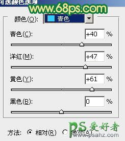 2、创建可选颜色调整图层,对青色进行调整,参数设置如图3,效果如图4。