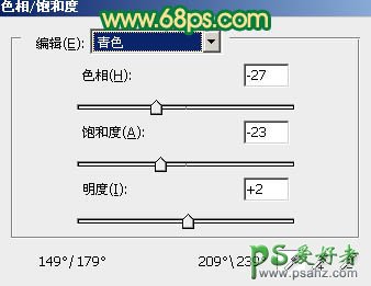 3、创建色相/饱和度调整图层,选择青色,用吸管吸取天空颜色调整,参数设置如图5,效果如图6。