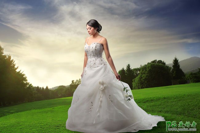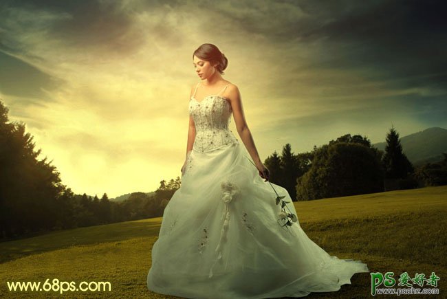 今天我们来学习一篇PS婚片后期调色实例教程,photoshop调出金色黄昏漂亮少女婚纱艺术照教程,素材图片虽然是在霞光中拍摄,不够暖色部分还不够明显,处理的时候需要用调色工具适当加强一下暖色,局部再加上一些高光即可。