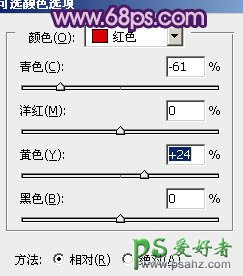 14、创建可选颜色调整图层,对红色进行调整,参数设置如图24,效果如图25。