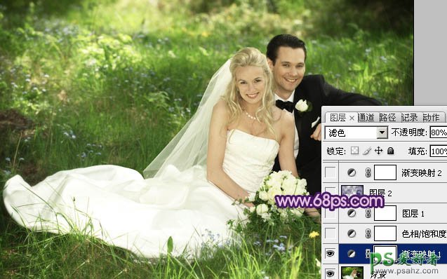 1、打开原图素材,创建渐变映射调整图层,颜色设置如图1,确定后把图层混合模式改为“滤色”,图层不透明度改为:80%,效果如图2。