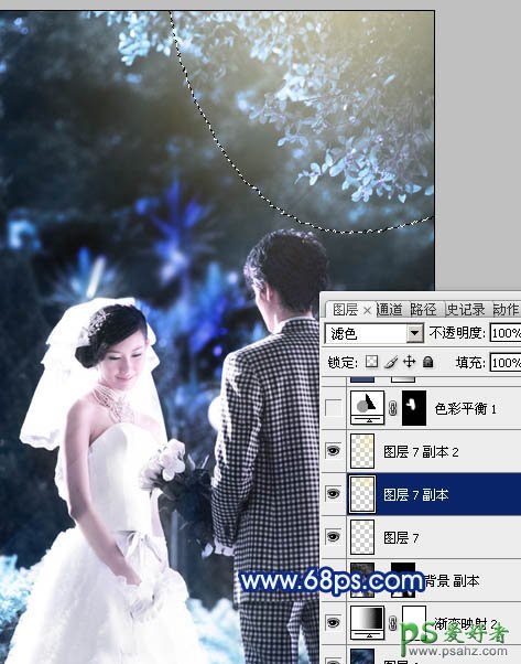 14、新建一个图层混合模式改为“滤色”,把前景颜色设置为:#F8EAA7,用画笔把下图选区部分涂上高光。