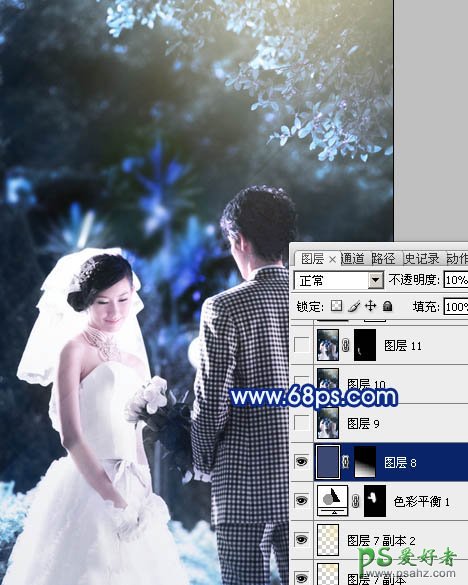 15、新建一个图层混合模式改为“滤色”,把前景颜色设置为:#3D4875,用画笔把底部涂上暗调。
