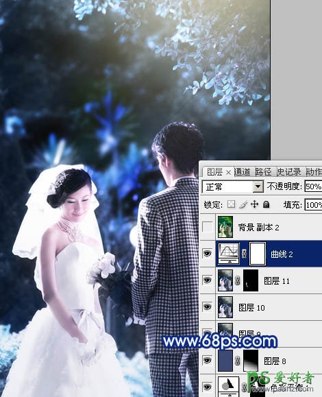 17、创建曲线调整图层,对蓝色进行调整,参数设置如图27,确定后把图层不透明度改为:50%,效果如图28。