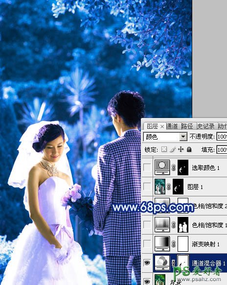 PS调色教程:给树林中的情侣婚片写真调出纯蓝艺术效果