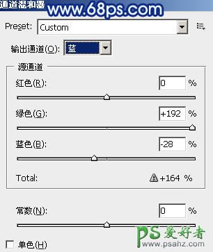 1、打开原图素材,创建通道混合器调整图层,对蓝色进行调整,参数设置如图1,确定后把图层混合模式改为“颜色”,效果如图2。