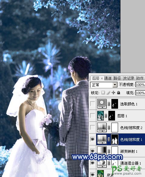 PS调色教程:给树林中的情侣婚片写真调出纯蓝艺术效果