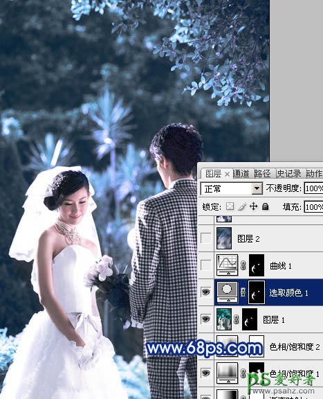 PS调色教程:给树林中的情侣婚片写真调出纯蓝艺术效果