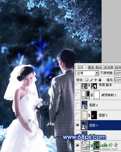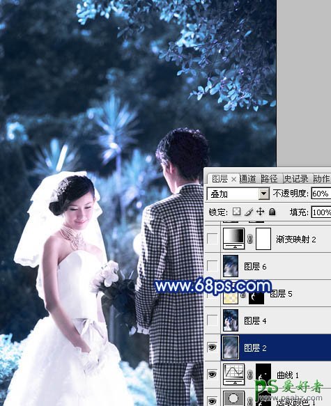 PS调色教程:给树林中的情侣婚片写真调出纯蓝艺术效果