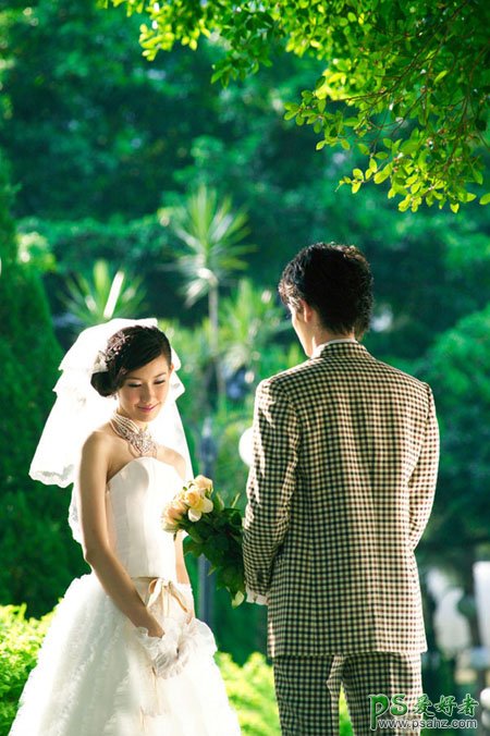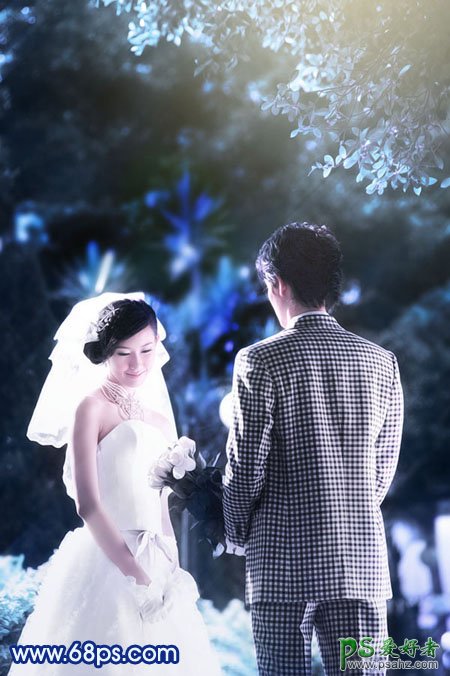 这里我们来和大家学习一篇PS婚片后期调色实例教程,PS调色教程:给树林中的情侣婚片写真调出纯蓝艺术效果,本教程介绍纯蓝色图片调色方法。大致过程:先用色相/饱和度或通道等,快速把图片调成蓝色调,然后再加强图片的层次感和色彩浓度,后期美化一下人物部分即可。