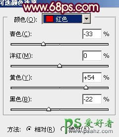 3、创建可选颜色调整图层,再对红,黄进行调整,参数设置如图5,6,效果如图7。
