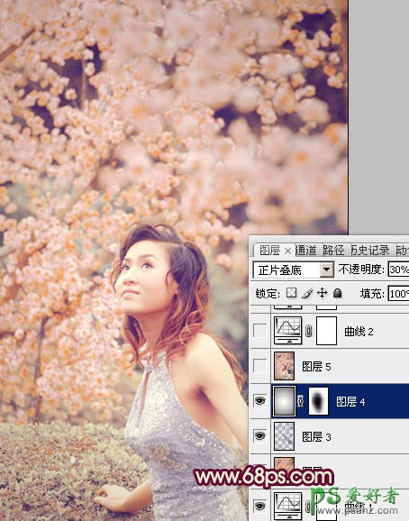 7、新建一个图层,选择渐变工具,颜色设置为黑白,然后由中心向边角拉出白色至黑色径向渐变。确定后把图层混合模式改为“正片叠底”,不透明度改为:30%,加上图层蒙版,用黑色画笔把中间部分擦出来,如下图。
