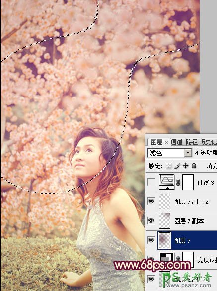 12、新建一个图层混合模式改为“滤色”,把前景颜色设置为:#690845,用画笔把下图选区部分涂上高光,效果如下图。
