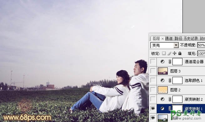 1、打开原图素材,创建渐变映射调整图层,颜色设置如图1,确定后把图层混合模式改为“变亮”,不透明度改为:50%,效果如图2。