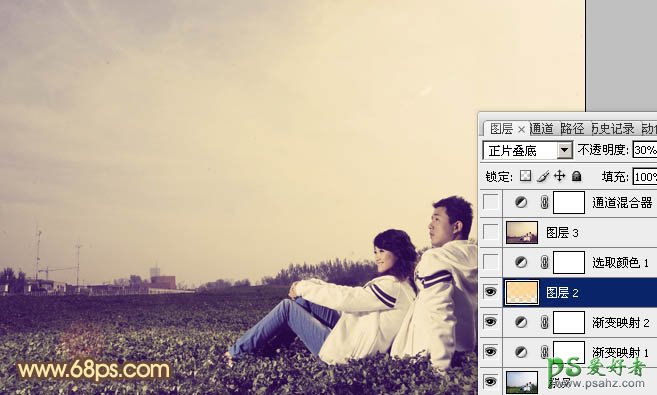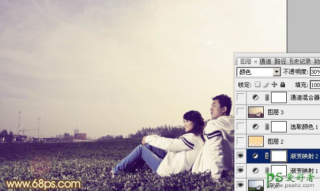 PS照片后期调色教程,photoshop调出金色夕阳下浪漫情侣外景图片特效,紫黄色图片有种古典的味道。调色的方法也比较简单,主要是用渐变映射调整设置主色。然后再适当加强图片的层次,局部调整好颜色和细节即可。 最终效果 原图 1、打开原图素