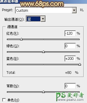6、创建通道混合器调整图层,对蓝色进行调整,参数设置如图10,确定后把不透明度改为:10%,效果如图11。