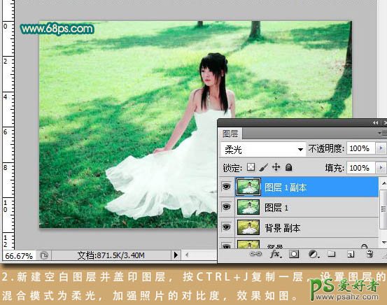 2、新建一个图层,按Ctrl + Alt + Shift + E 盖印图层。按Ctrl + J 把盖印图层复制一层,图层混合模式改为“柔光”,加强照片的对比度。